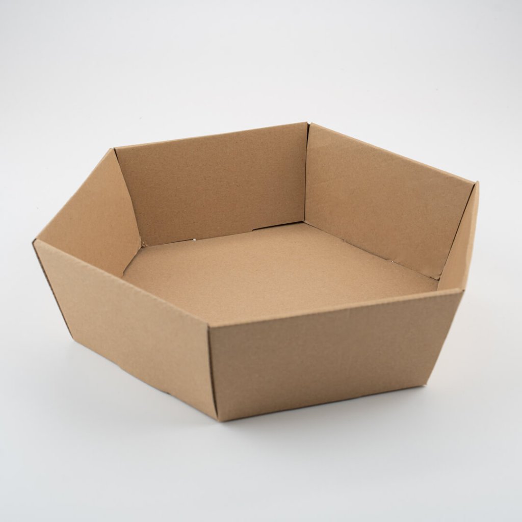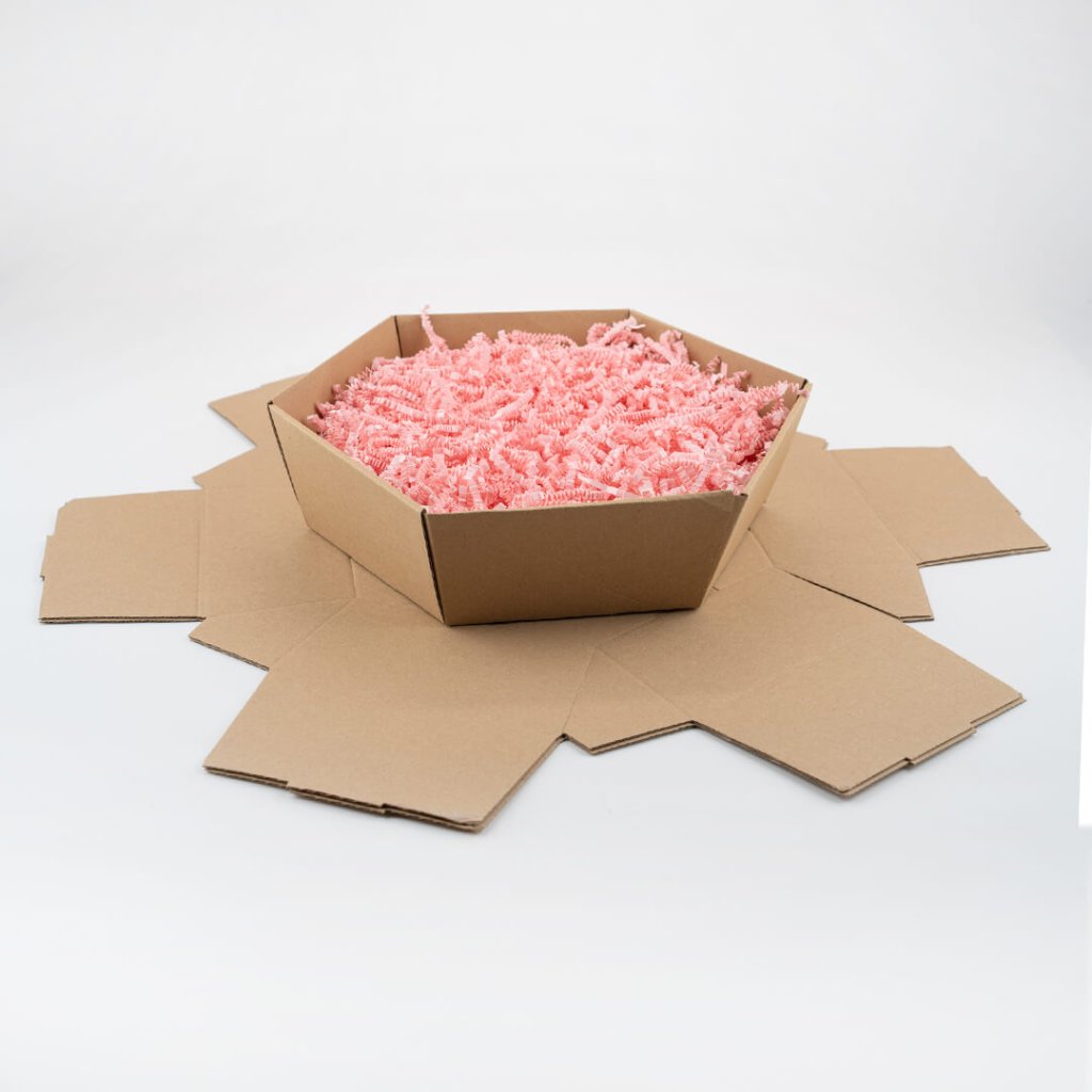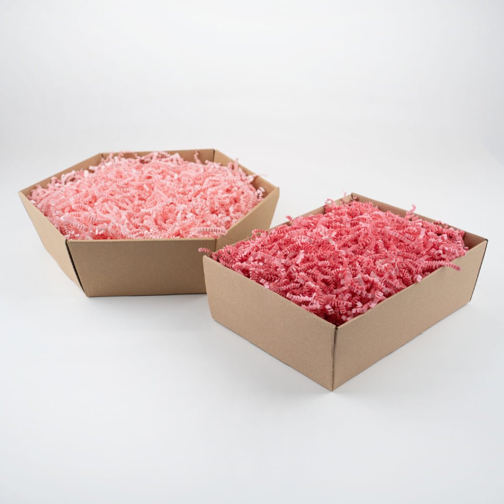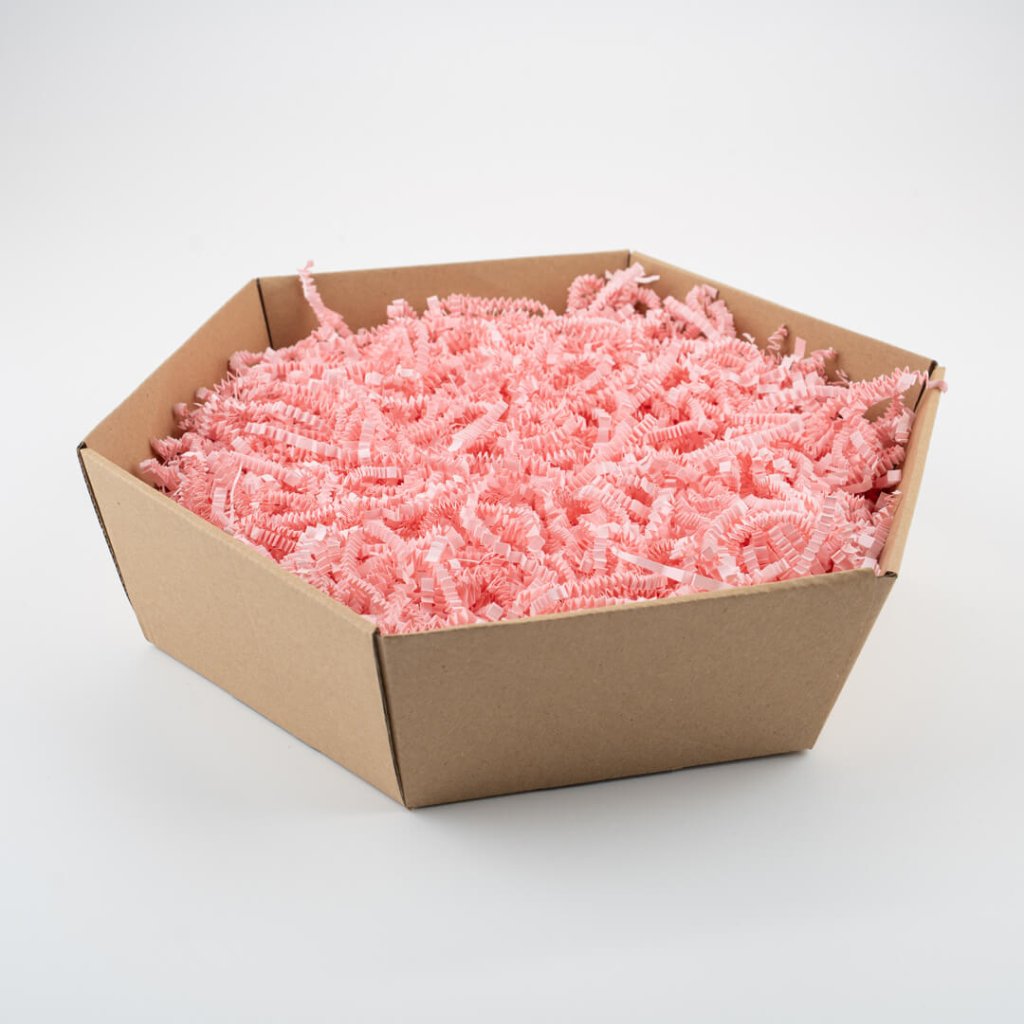 - Šestihranný dárkový koš – doporučujeme, pokud chcete balit větší produkty, jako je dárkové balení vína, sektu nebo větší množství delikates. Nabízí prostorné dno a efektní tvar, který zaujme na první pohled.