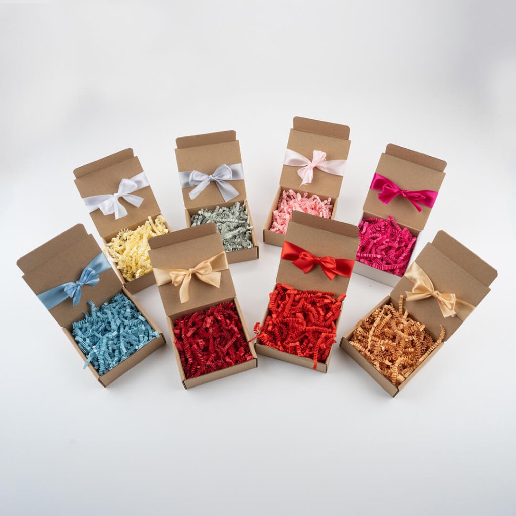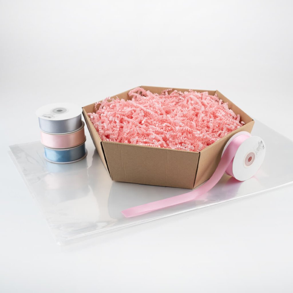 Pokud například sestavujete dárkový koš pro ženy, doporučujeme výplně v jemných nebo elegantních odstínech – např. plameňák růžová, béžová (sloní kost) nebo zlatá karamel. Naopak pro dárkový koš pro muže můžete zvolit černou výplň, tmavě zelenou, modrou (světle královskou) nebo neutrální šedou barvu. Společně s koši můžete vybrat z více než 20 odstínů saténových stuh.