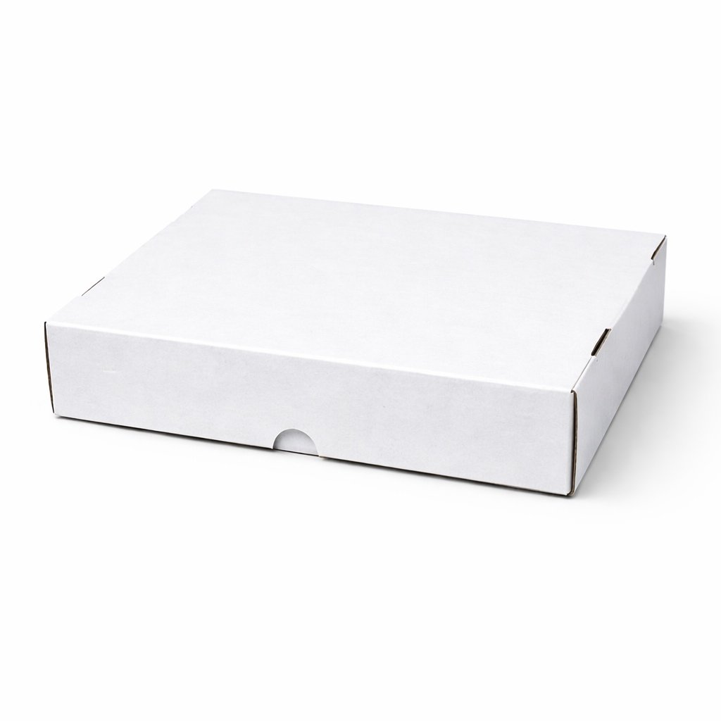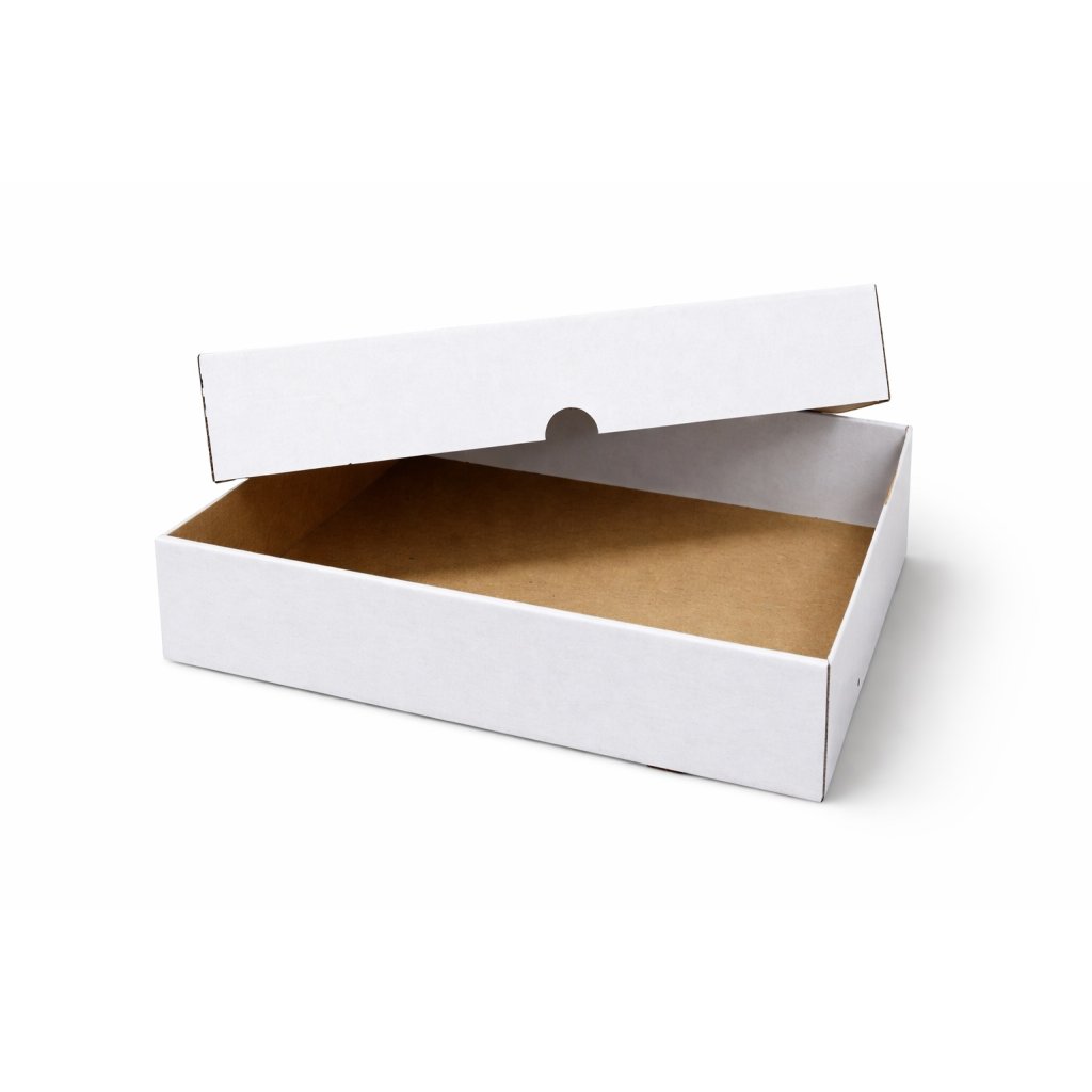 Bílá krabice s víkem je praktickým řešením pro jednoduché zabalení. Samostatné dno a víko umožňuje snadnou manipulaci a rychlé složení během několika sekund.