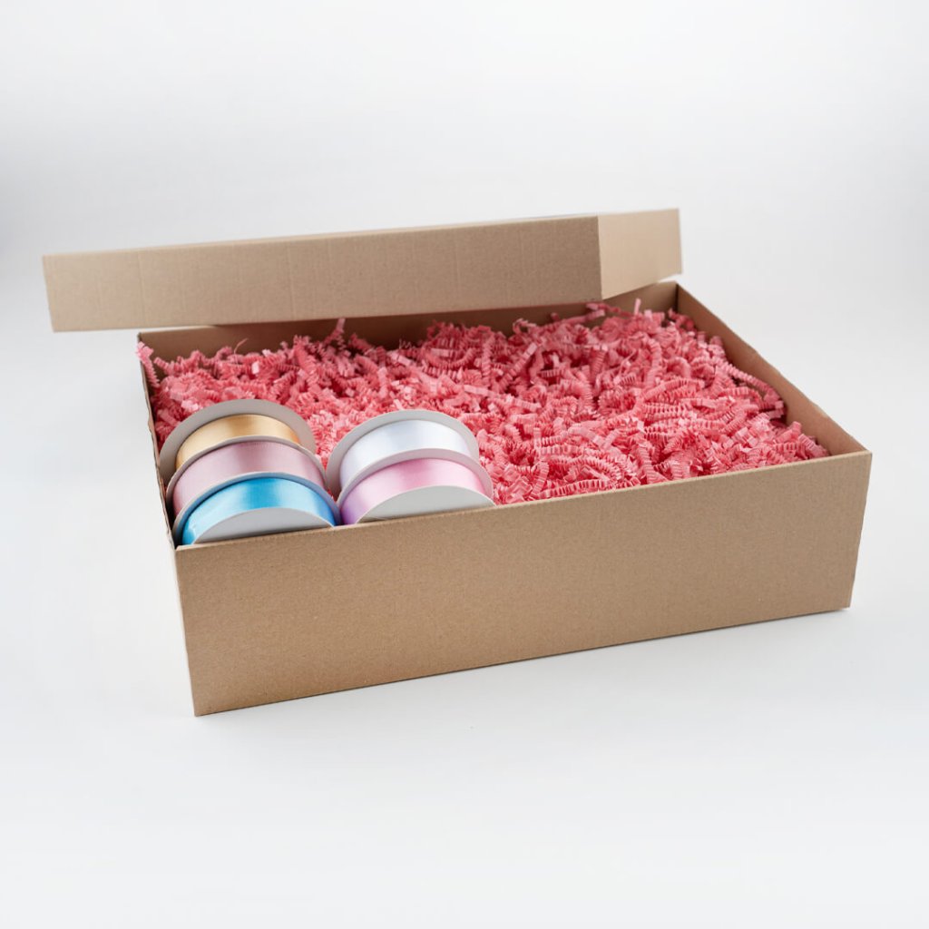 - Barevná výplň (fancypack mix) – nabízíme více odstínů, které můžete sladit se saténovými stuhami a barvou svého obsahu. Díky široké nabídce snadno vytvoříte harmonický a originální dárkový set na míru. Výplň na míru si můžete objednat přes poptávkový formulář zde.