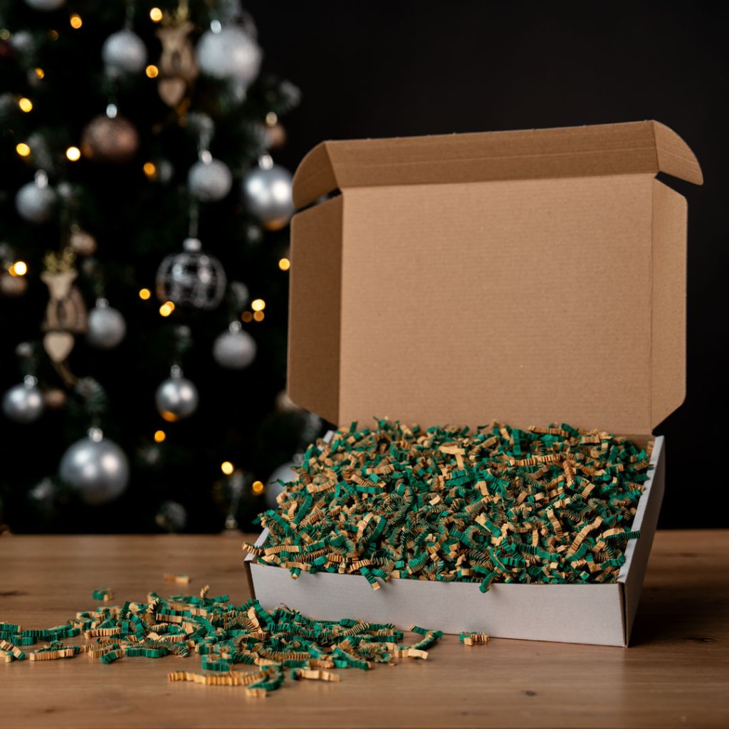 Karamelově zlatá a tmavě zelená recyklovatelná barevná papírová výplň není jen o vizuálním dojmu, ale také hraje klíčovou roli v ochraně obsahu vašich zásilek. Vyrobená s ohledem na životní prostředí z recyklovaného papíru, tato výplň poskytuje spolehlivou ochranu vašich produktů a dodává jim správný efekt pro vánoční balíčky Vaši zákazníci budou nadšeni z rozbalení zásilek. Vhodná pro dárkové koše na Vánoce.